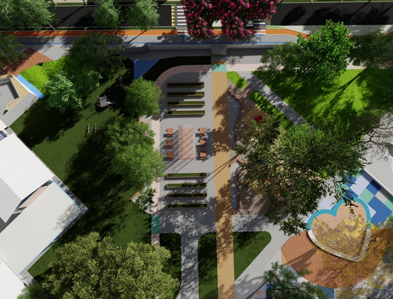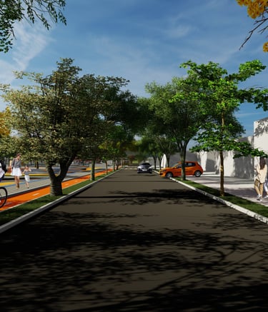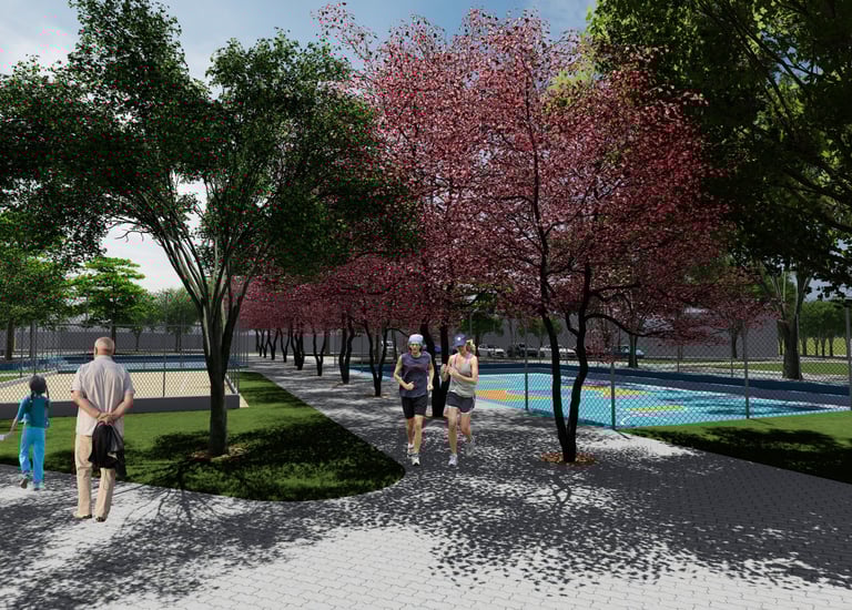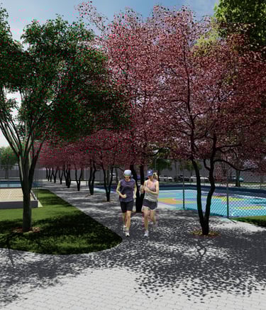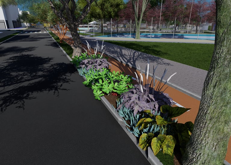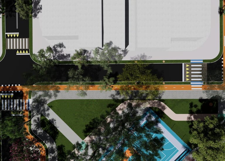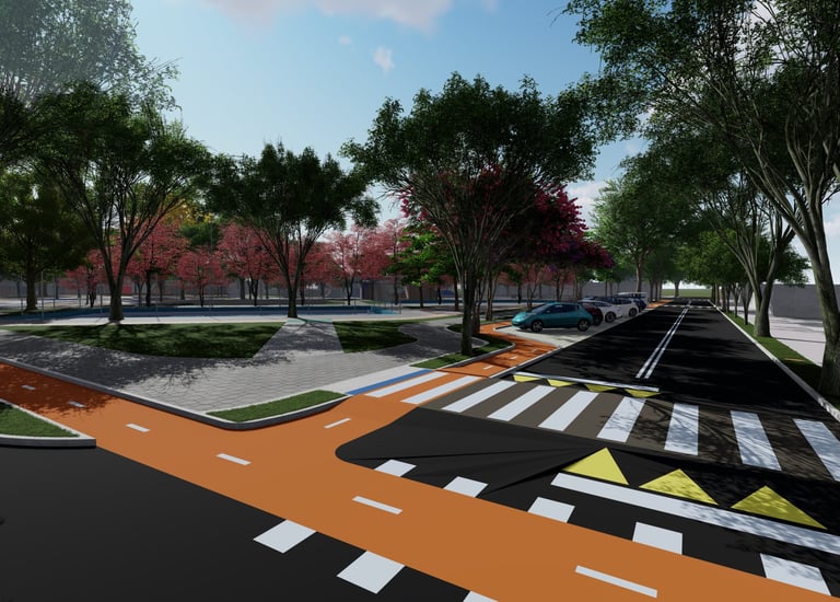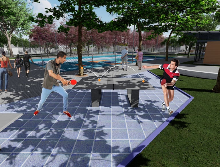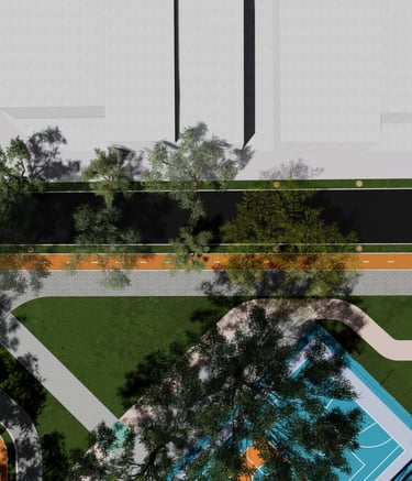 As intervenções urbanas propostas têm como essência a humanização dos espaços, priorizando calçadas acessíveis, áreas de convivência e equipamentos que convidam à permanência e ao encontro entre as pessoas. Ao mesmo tempo, contribuem para o combate às mudanças climáticas por meio da ampliação da arborização, da retenção das águas pluviais, do uso de energia limpa e da criação de áreas verdes que reduzem ilhas de calor. Além disso, buscam a integração entre bairro e cidade, conectando diferentes públicos, idades e atividades, e articulando esporte, cultura e educação em um ambiente multifuncional que fortalece os laços comunitários e a relação com a natureza.