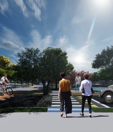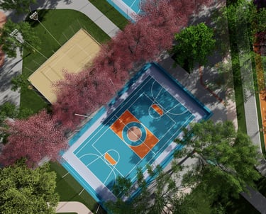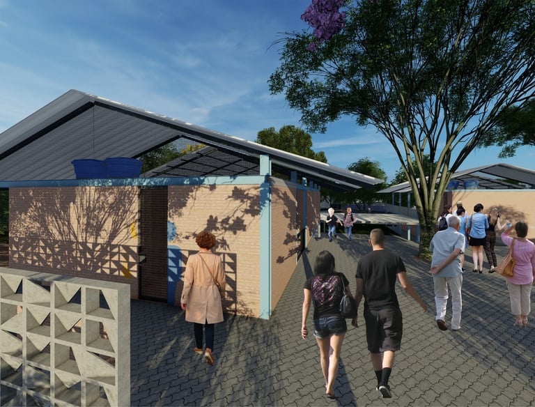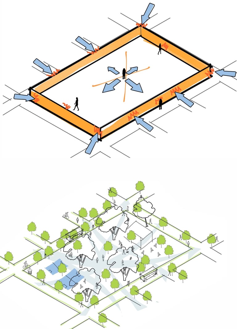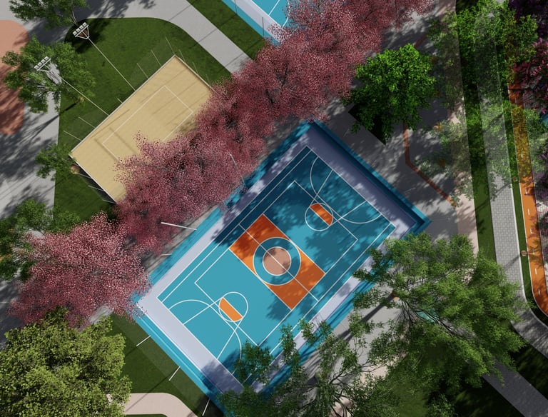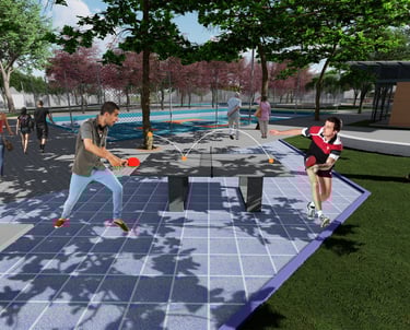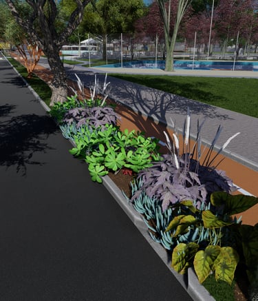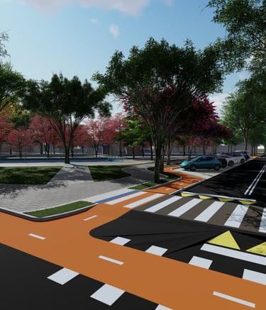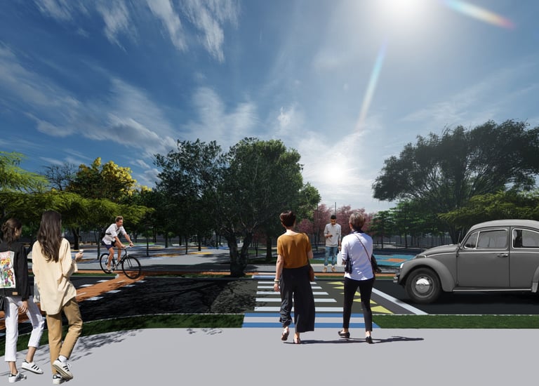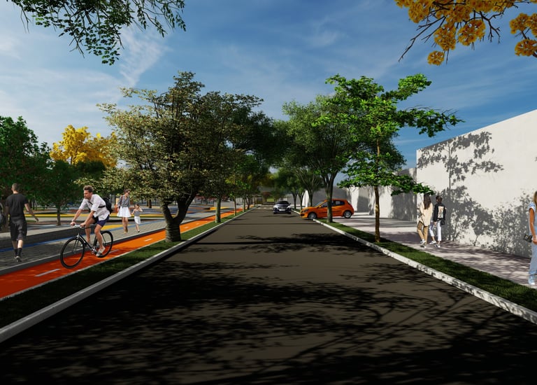 As intervenções urbanas propostas têm como essência a humanização dos espaços, priorizando calçadas acessíveis, áreas de convivência e equipamentos que convidam à permanência e ao encontro entre as pessoas. Ao mesmo tempo, contribuem para o combate às mudanças climáticas por meio da ampliação da arborização, da retenção das águas pluviais, do uso de energia limpa e da criação de áreas verdes que reduzem ilhas de calor. Além disso, buscam a integração entre bairro e cidade, conectando diferentes públicos, idades e atividades, e articulando esporte, cultura e educação em um ambiente multifuncional que fortalece os laços comunitários e a relação com a natureza.